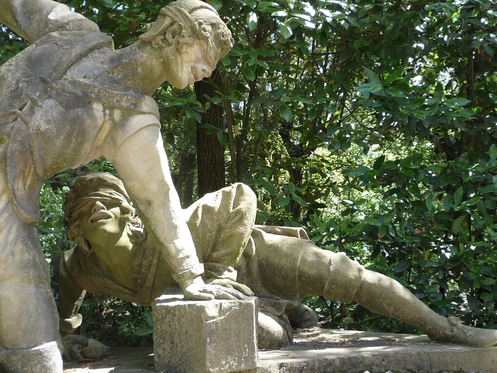 Sstatues of the players of saccomazzone at Boboli Gardens in Firenze. Two blindfolded players, with one hand on a rock, try to drive out the enemy by hitting it with a long, knotted rag.