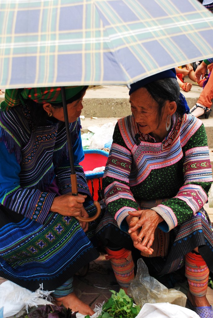 Two ladies wearing traditional Sapa dresses, at Bac Ha Market.