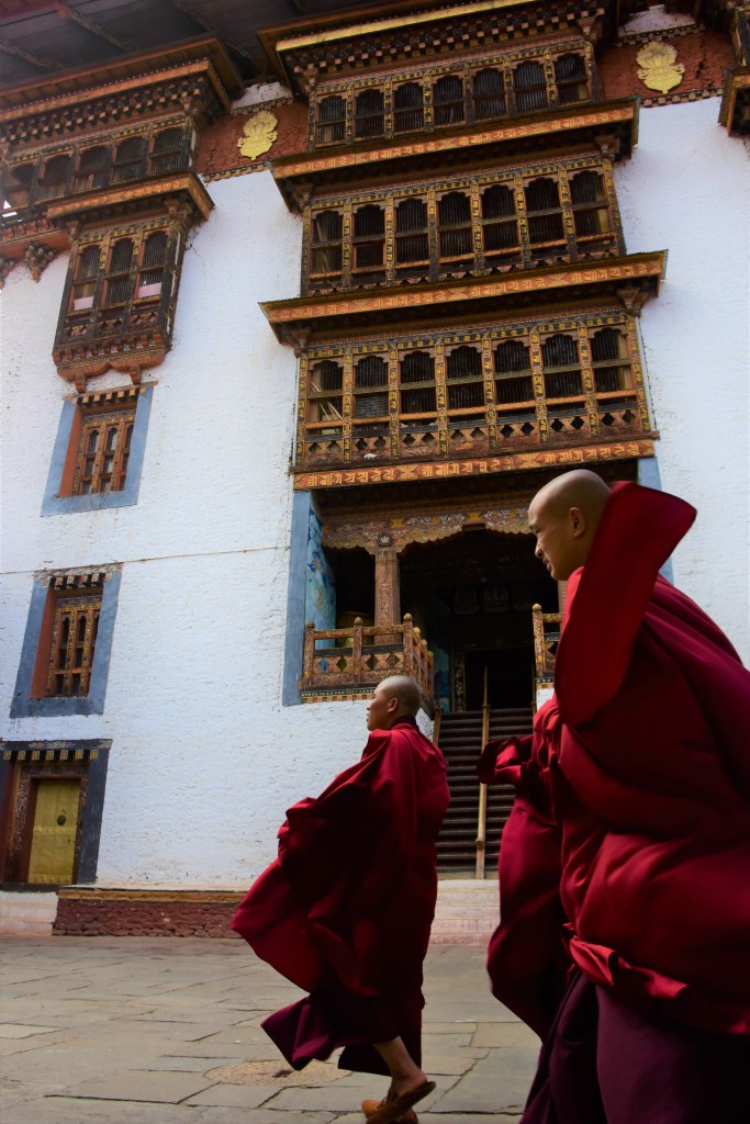 Monges em Punakha Dzong ou Palácio da Grande Felicidade, no Butão.